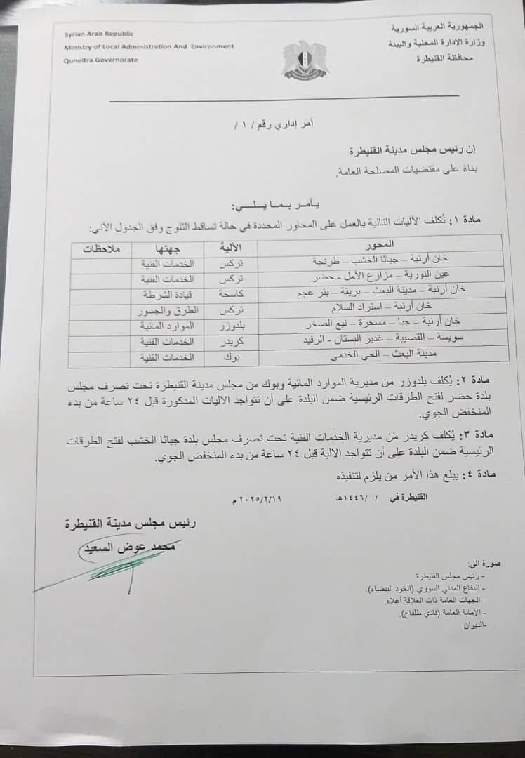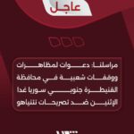 أحدث الخرائط: التصعيد الإسرائيلي في سورية مطلع عام 2025:الغارات، الأهداف، والتداعيات – مركز حرمون للدراسات تطورات العدوان الإسرائيلي: 2025-02-23 22:16:00 دعوات لمظاهرات ووقفات شعبية في محافظة القنيطرة جنوبي سوريا غدا الإثنين ضد تصريحات نتنياهو المصدر: تلفزيون سوريا 2025-02-22 13:29:00 دخول دورية إسرائيلية باتجاه بلدة أوفانيا بريف القنيطرة الشمالي ووصولها الى محيط مدينة خان أرنبة بالقنيطرة جنوب غرب سوريا المصدر: Nour Golan 2025-02-22 00:18:00 الجيش الإسرائيلي يطلق قنابل مضيئة فوق بلدة جباتا الخشب و بلدة حضر وحرش جباتا الخشب بريف القنيطرة الشمالي. المصدر: Nour Golan بقية التطورات ← القنيطرة في الإعلام السوري فبراير 13, 2025 جيش الاحتلال الإسرائيلي يدخل قرية صيدا الجولان ويقيم حاجزاً مؤقتاً تلفزيون سوريا فبراير 14, 2025 نفذت عملية استخباراتية.. إسرائيل تتوغل بريف القنيطرة الجنوبي تلفزيون سوريا فبراير 24, 2025 نتنياهو: نطالب بإخلاء جنوبي سوريا من القوات العسكرية للنظام الجديد بشكل كامل تلفزيون سوريا القنيطرة في الإعلام العربي فبراير 19, 2025 التصعيد الإسرائيلي في سورية مطلع عام 2025:الغارات، الأهداف، والتداعيات القنيطرة في الإعلام العبري فبراير 13, 2025 جيش الاحتلال الإسرائيلي يدخل قرية صيدا الجولان ويقيم حاجزاً مؤقتاً تلفزيون سوريا فبراير 14, 2025 نفذت عملية استخباراتية.. إسرائيل تتوغل بريف القنيطرة الجنوبي تلفزيون سوريا فبراير 24, 2025 نتنياهو: نطالب بإخلاء جنوبي سوريا من القوات العسكرية للنظام الجديد بشكل كامل تلفزيون سوريا أرشيف الوثائق الرسمية محافظة القنيطرة وبالتعاون مع وزارة النقل السورية تحدد أجور تعرفة النقل على خطوط المحافظة. يعلن مجلس مدينة القنيطرة، بالتعاون مع مديرية الخدمات الفنية ومديرية الموارد المائية واستصلاح الأراضي، عن حالة طوارئ خفيفة اعتباراً من مساء اليوم الخميس روابط رسمية مدينة القنيطرة الحرّة – قناة رسمية مدينة القنيطرة الحرّة – قناة رسمية وكالة الأنباء العربية السورية – سانا أصوات من القنيطرة (قريبًا)